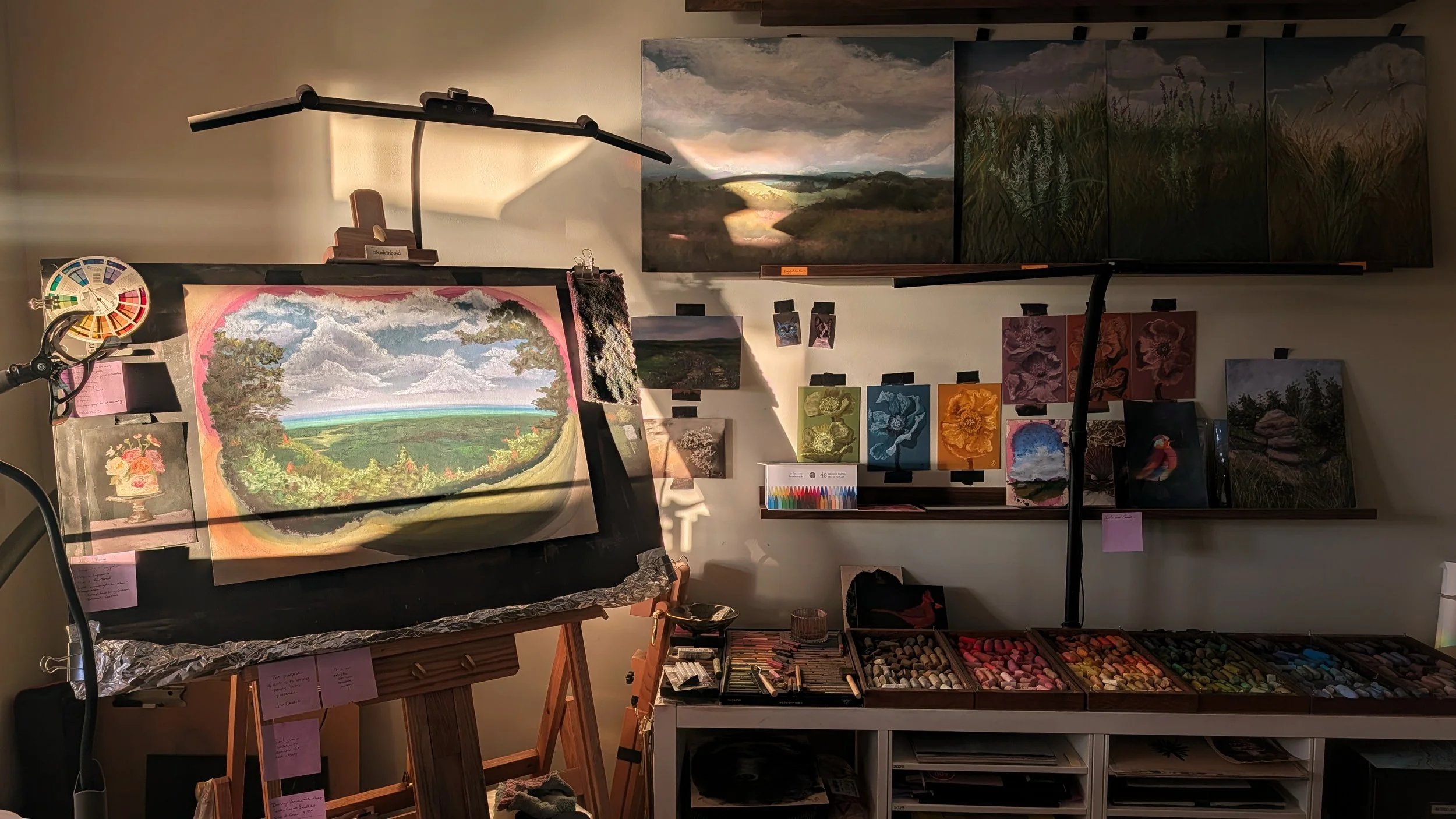 My studio is the breakfast nook right off my kitchen. It is not separate from the noise of family life. The dog has a bed in there. The cat occasionally dignifies the space with his presence, usually on my chair at the worst possible moment. And somehow, none of that matters once the pastels are in my hands. The homeschool day, the dishes, the news I was trying not to think about, it is all still there, but I am here. Present. Making something.