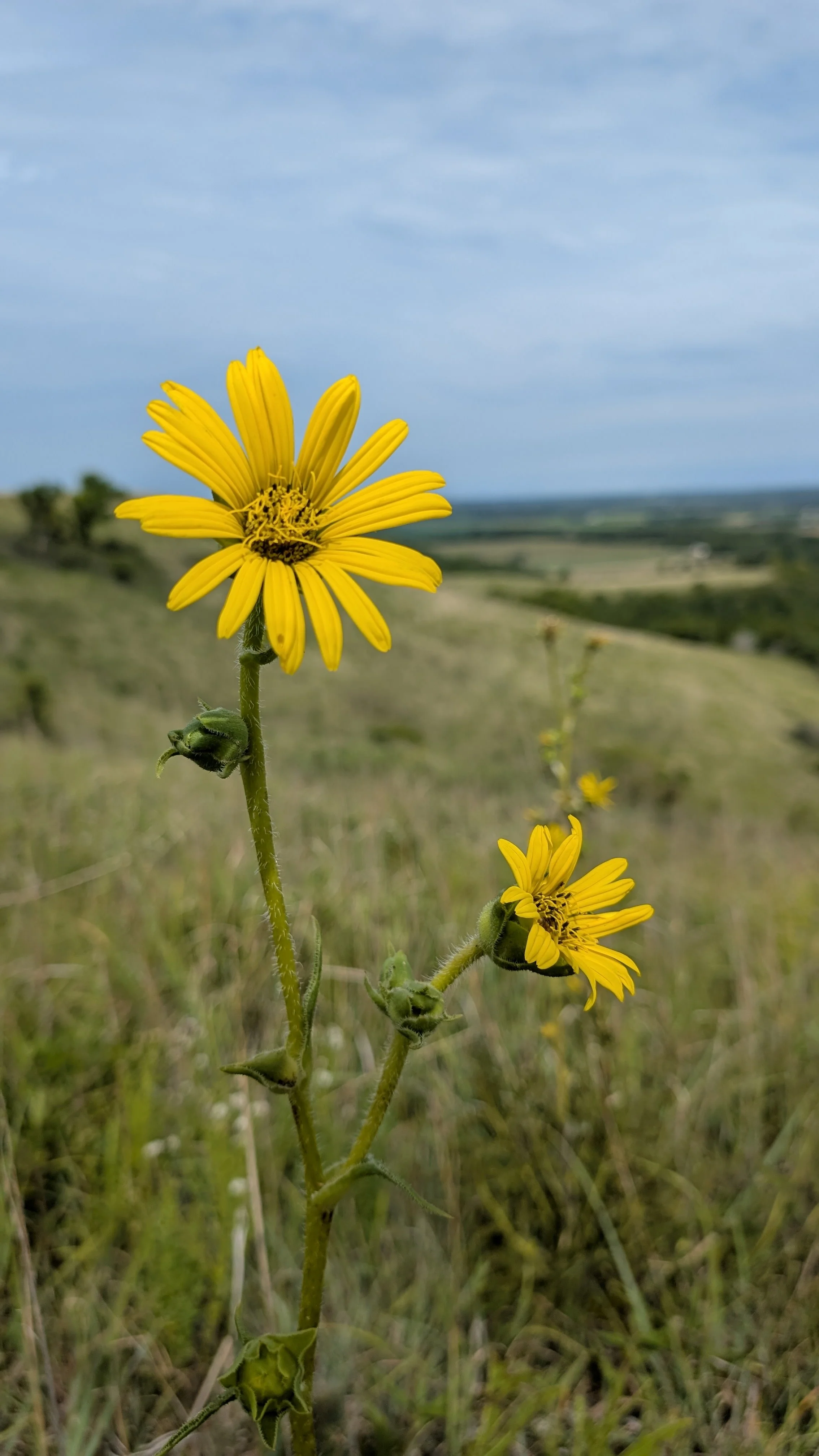 I call these sunflowers, though they don’t quite fit the picture-book idea. The prairie is full of them, bright yellow faces glowing against late-summer greens. Walking past them felt like tiny bursts of joy, cheering me on as the trail got harder.