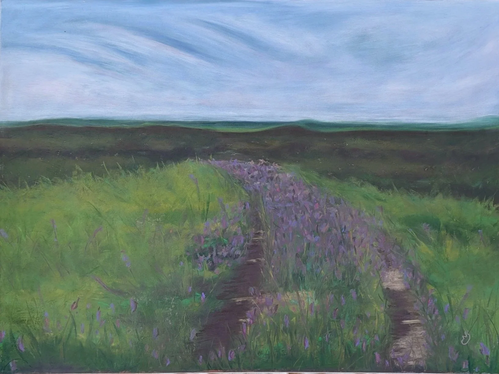 A close look at prairie resilience, purple blooms reaching upward with a bright red ladybug along for the ride. This painting is for noticing the small miracles that show up when you slow down and look closely.